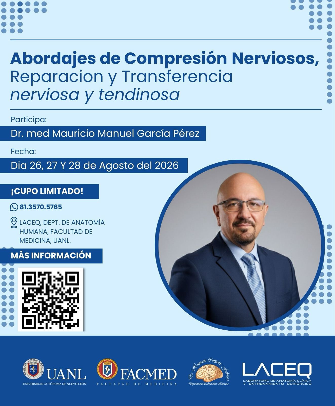 La Facultad de Medicina de la Universidad Autónoma de Nuevo León, a travĆ©s del Laboratorio de AnatomĆa ClĆnica y Entrenamiento QuirĆŗrgico (LACEO) y el Departamento de AnatomĆa Humana, invita a participar en el curso teórico-prĆ”ctico āAbordajes de Compresión Nerviosos, Reparación y Transferencia Nerviosa y Tendinosaā, una actividad acadĆ©mica enfocada en el estudio integral de las tĆ©cnicas quirĆŗrgicas aplicadas al sistema nervioso perifĆ©rico y estructuras tendinosas.
